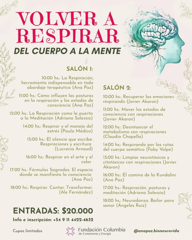 El 23 de noviembre vas a poder acceder a un evento único en el mundo, con un total de 16 masterclasses especializadas en respiraciones terapéuticas. ¡A continuación podés ver toda toda toda la programación! 0:00 hs:Salón 1: La Respiración. La herramienta indispensable en todo abordaje Terapéutico. Con Ana Paz.Salón 2: Recuperar las Emociones Respirando. Con @javier.akaron […]